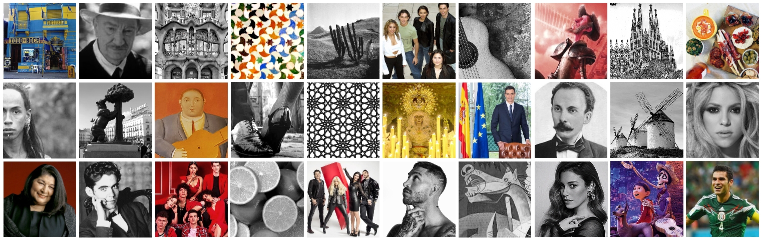 Images : Autel de Día de Muertos, fête mexicaine importante (1) • Image du 23-F, coup d’état militaire du 23 février 1981 (2) • Les Ménines (Las Meninas), célèbre peinture de l’espagnol Diego Vélasquez (3) • Affiche du film Le Labyrinthe de Pan (el Laberinto del Fauno), du réalisateur mexicain, Guillermo del Toro (4) • J Balvin, chanteur de reggaeton colombien, artiste hispanique le plus écouté au monde sur Spotify (5) • Ballon au stade Santiago Bernabeu à Madrid (6)